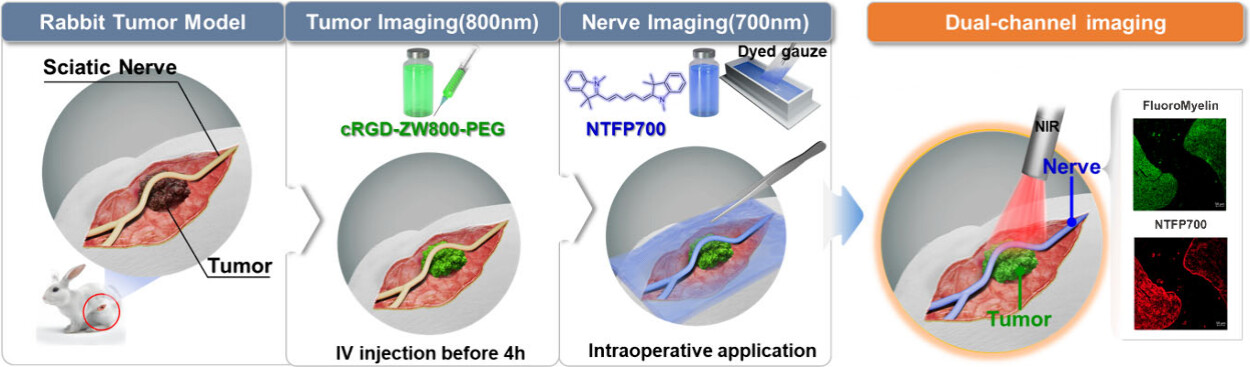 연구팀은 신경 특이적 형광 조영제인 ‘NTFP700’을 새롭게 개발하고, 기존 종양 타깃 조영제 ‘cRGD-ZW800-PEG’과 함께 활용해 700nm 파장에서 신경을 청색 형광으로, 800nm 파장에서 종양을 녹색 형광으로 시각화하는 이중채널 근적외선(NIR) 영상기법을 구현했다. 이 기술은 토끼 좌골신경 주위 종양 모델에 적용해 수술 중 종양과 신경을 동시에 식별하는 데 성공했다. 종양 표지를 위해 cRGD-ZW800-PEG를 수술 4시간 전 정맥 주사해 800nm 채널로 관찰했고, 신경 표지는 NTFP700을 거즈에 흡착시켜 수술 중 700nm 채널로 적용했다.